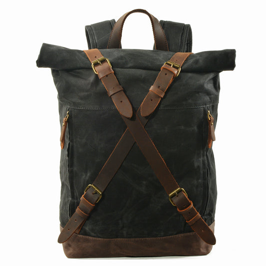 Vintage Canvas Cowhide Leather Backpack – Roll Top Travel Outdoor Daypack